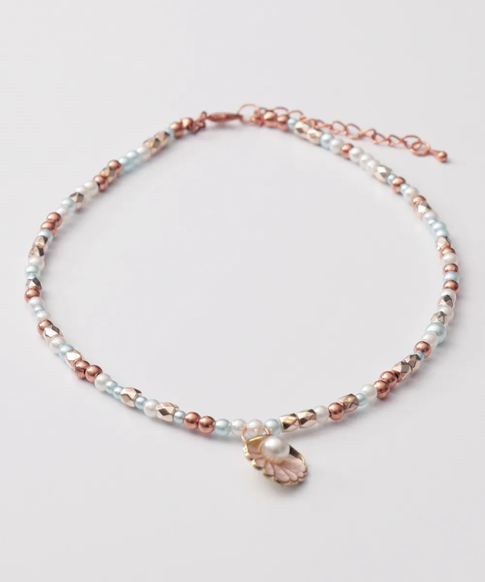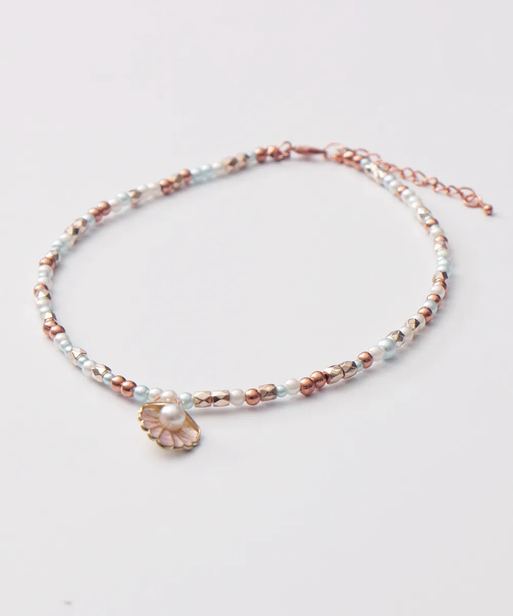 • שרשרת בשילוב חרוזים עם תליון צדפה ורוד
