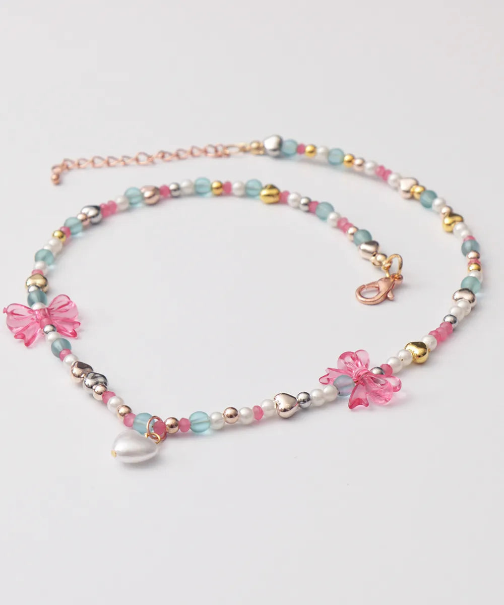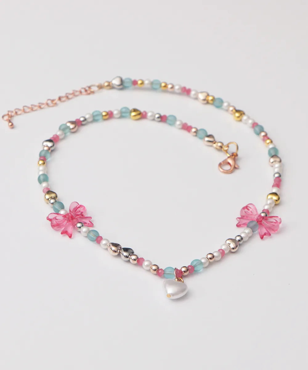• שרשרת עשויה חרוזים צבעוניים עם פפיונים ורודים ותליון לב פנינה